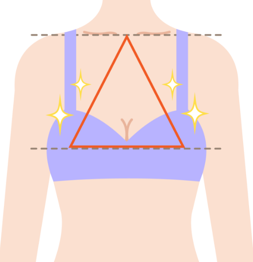 「胸の黄金比」と呼ばれる美しいバストラインは、鎖骨の中央から乳頭までを結ぶ線と、左右のバストトップ同士を結ぶ線で構成された三角形(図の三角形ABC)が正三角形になると理想的とされています。また、バストトップが鎖骨と肘の中間に位置することも、バストラインが美しいとされる要素の一つです。