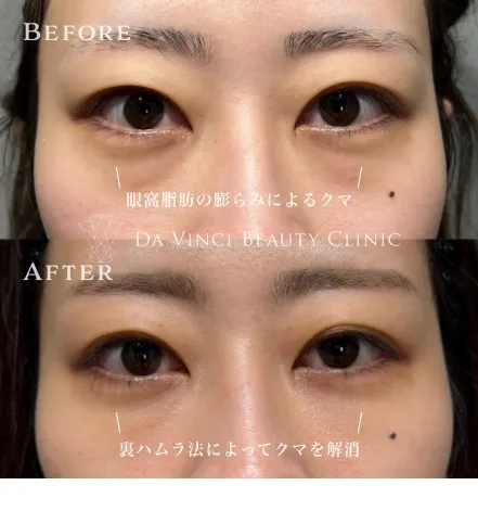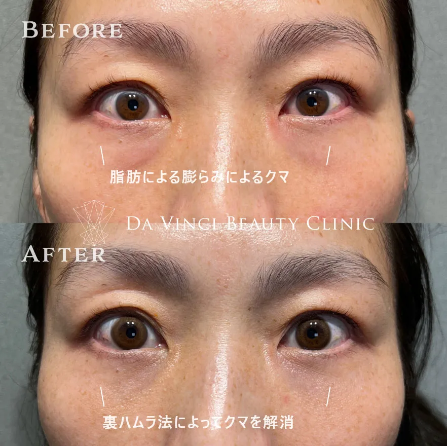 従来の「切らないクマ取り」として知られる経結膜脱脂術と同様、皮膚に傷を残さずに行える点は共通していますが、裏ハムラ法では脂肪を取り除くだけでなく、目の下に均等に広げるよう移動させるため、より自然で滑らかな仕上がりが期待できます。