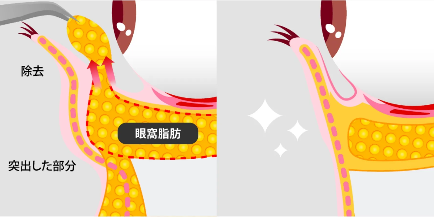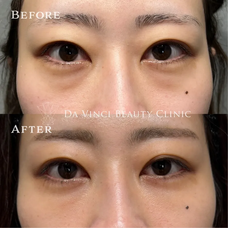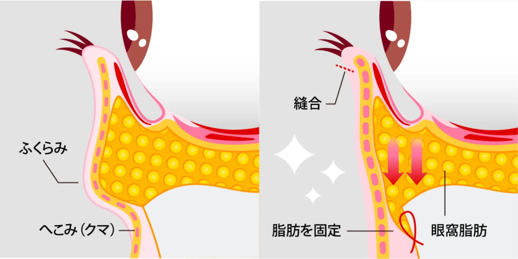 目の下の膨らみと凹みを同時に解消するため、下まぶたの裏側に小さな切開を加え、余分な眼窩脂肪を適切な位置へ移動させ、目の下を平らに整えます。この施術により、目元の凹凸が改善され、若々しく明るい印象へと導きます。
