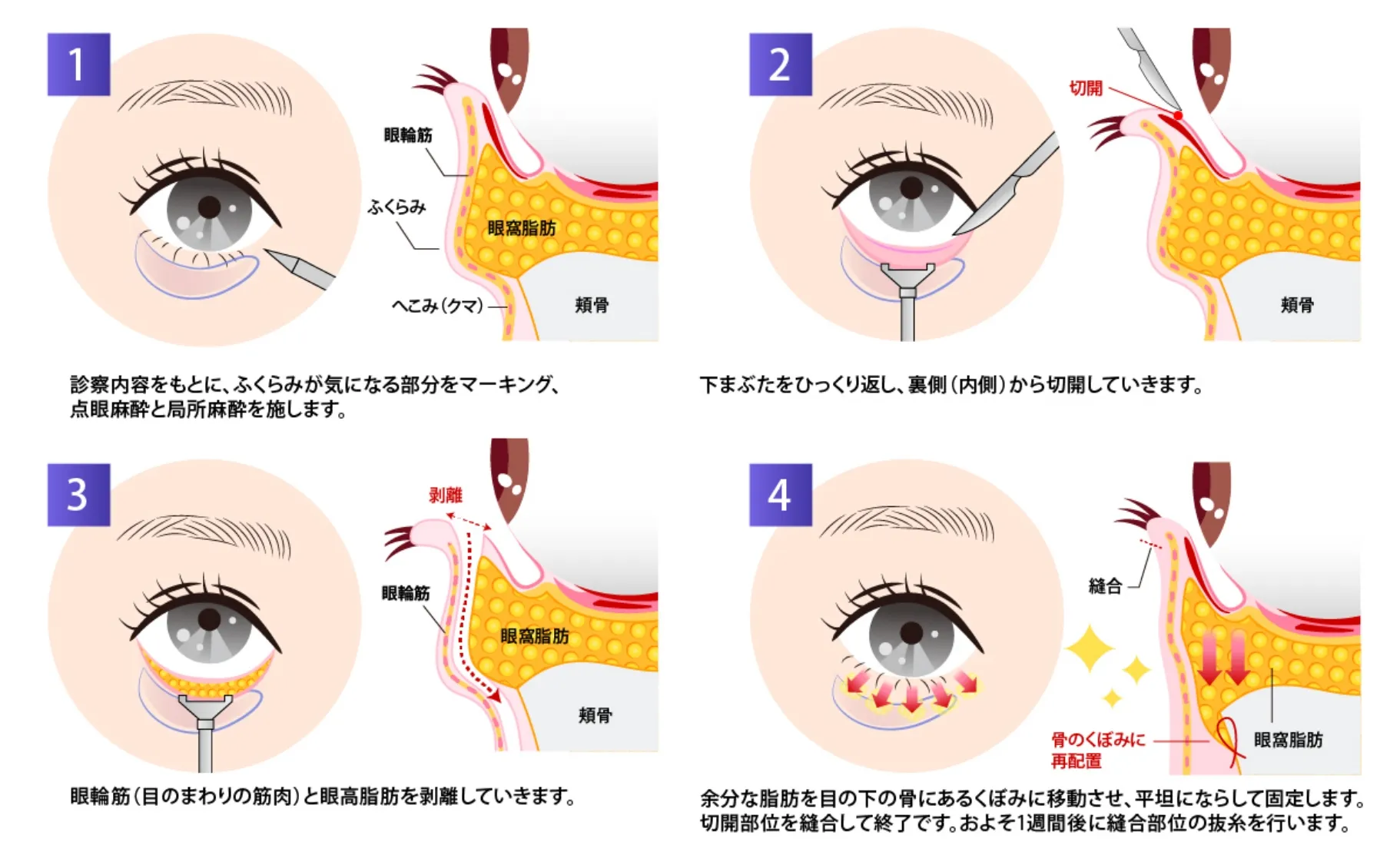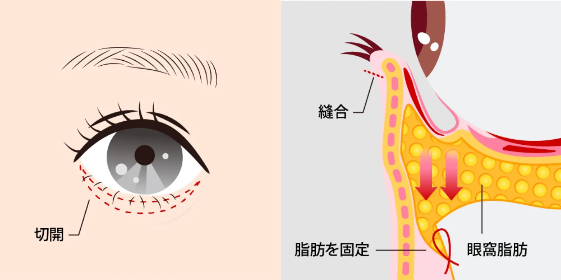 下まぶたの裏側に小さな切開を加え、余分な眼窩脂肪を取り除くため、切開範囲が非常に狭く、術後の腫れを最小限に抑えられます。剥離範囲も狭いため、ダウンタイムが短いのが特徴です。