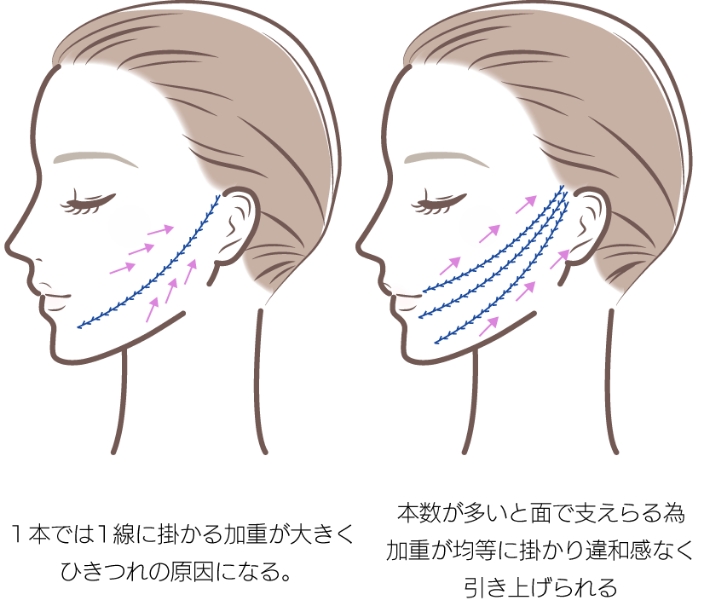 個人差はありますが、糸リフトの効果を最大限に引き出すには、ある程度の数の糸を挿入することが重要です。少ない本数の糸では、皮膚をしっかりと支えられず、リフトアップ効果が不十分になる可能性があるためです。複数の糸で皮膚をしっかりと支えることで、より強力なリフトアップ効果が得られ、自然な仕上がりになります。